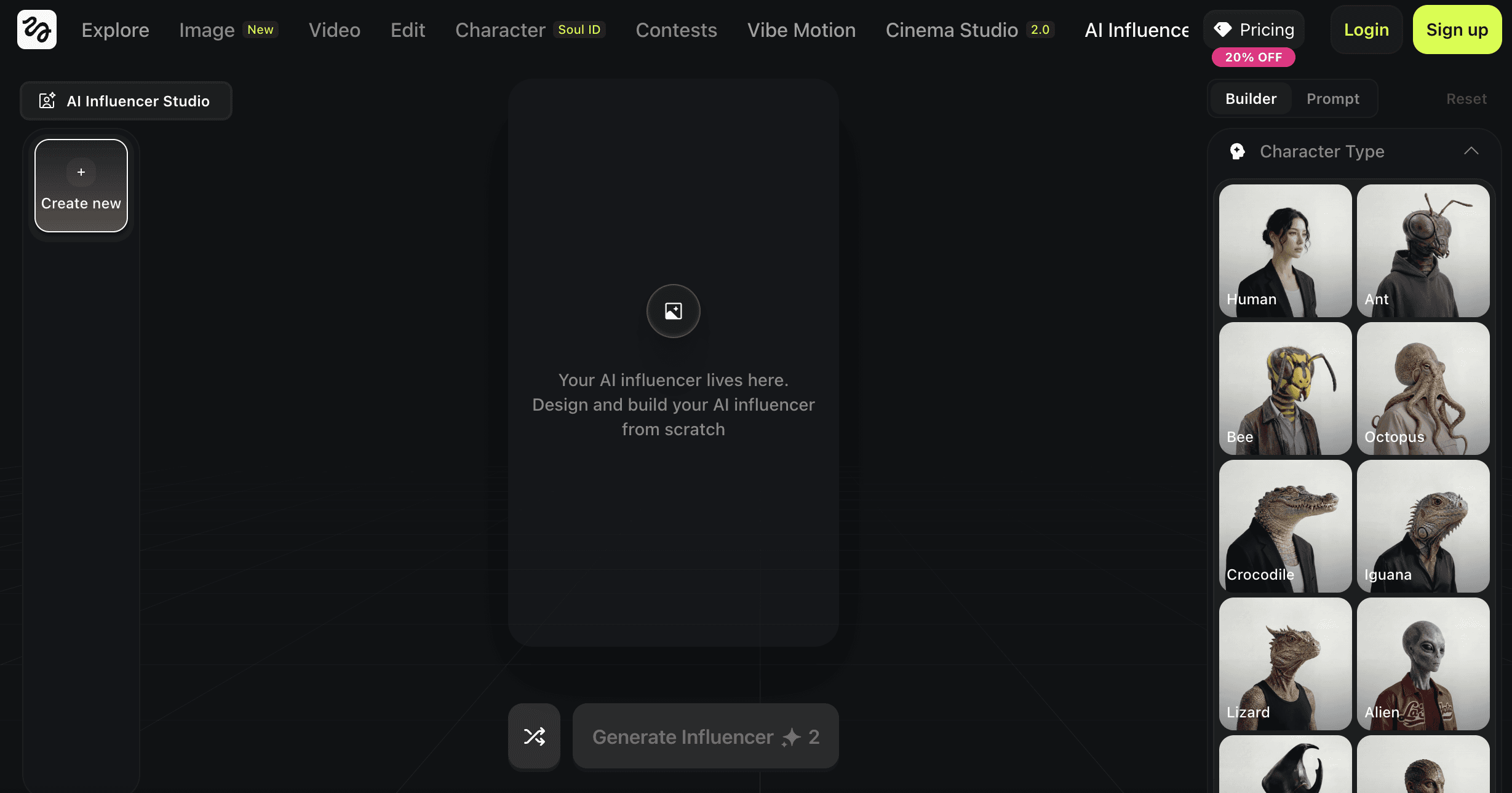 Pricing starts at about $16 per month for the Creator plan with 60 credits and up to 3 characters. The Influencer plan costs around $42 per month and supports more characters and credits.