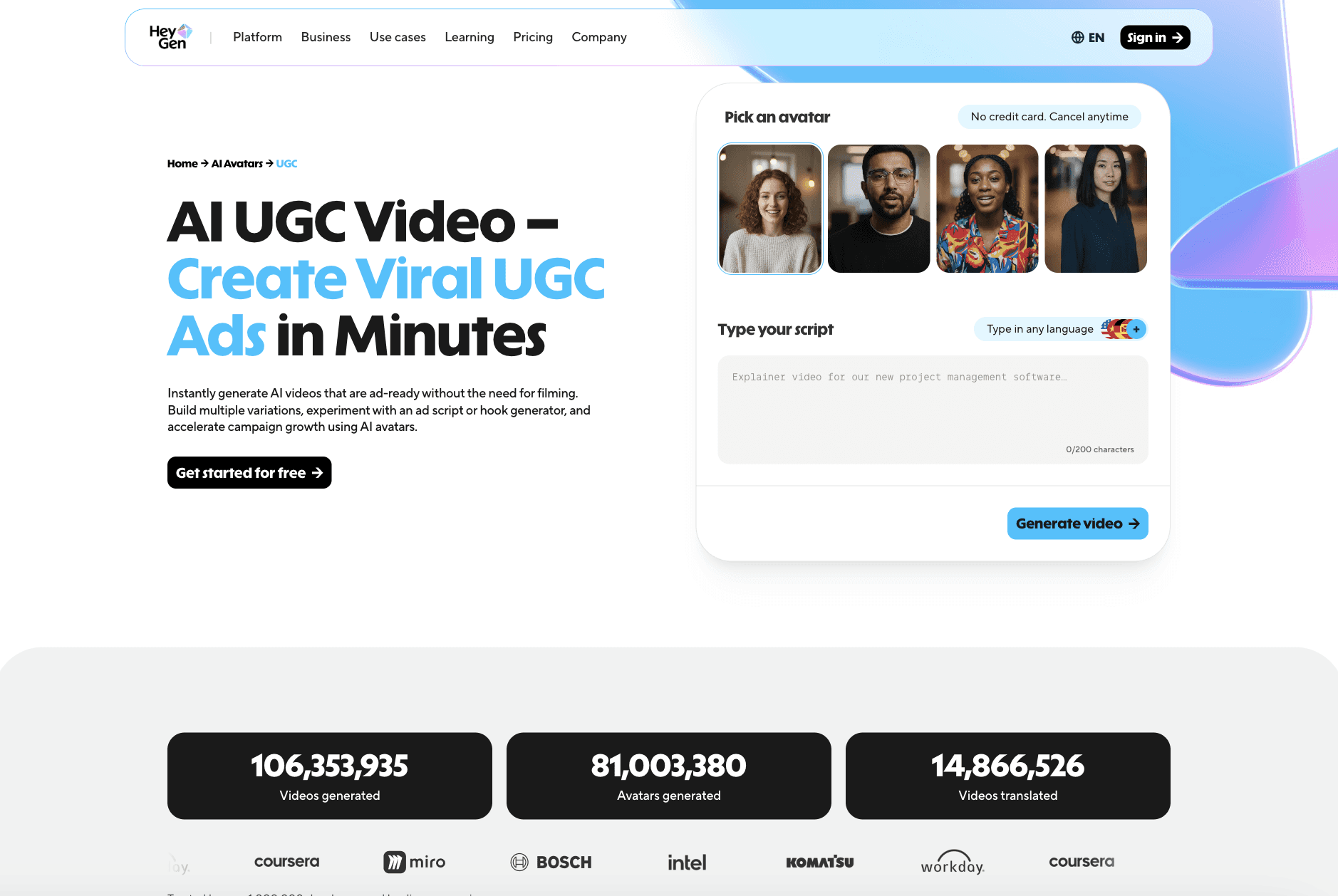 The Pro plan costs $99 per month and adds faster processing, higher limits, and 4K exports. HeyGen is best for teams and marketers who want reliable, scalable AI UGC with strong avatar quality and global language support.