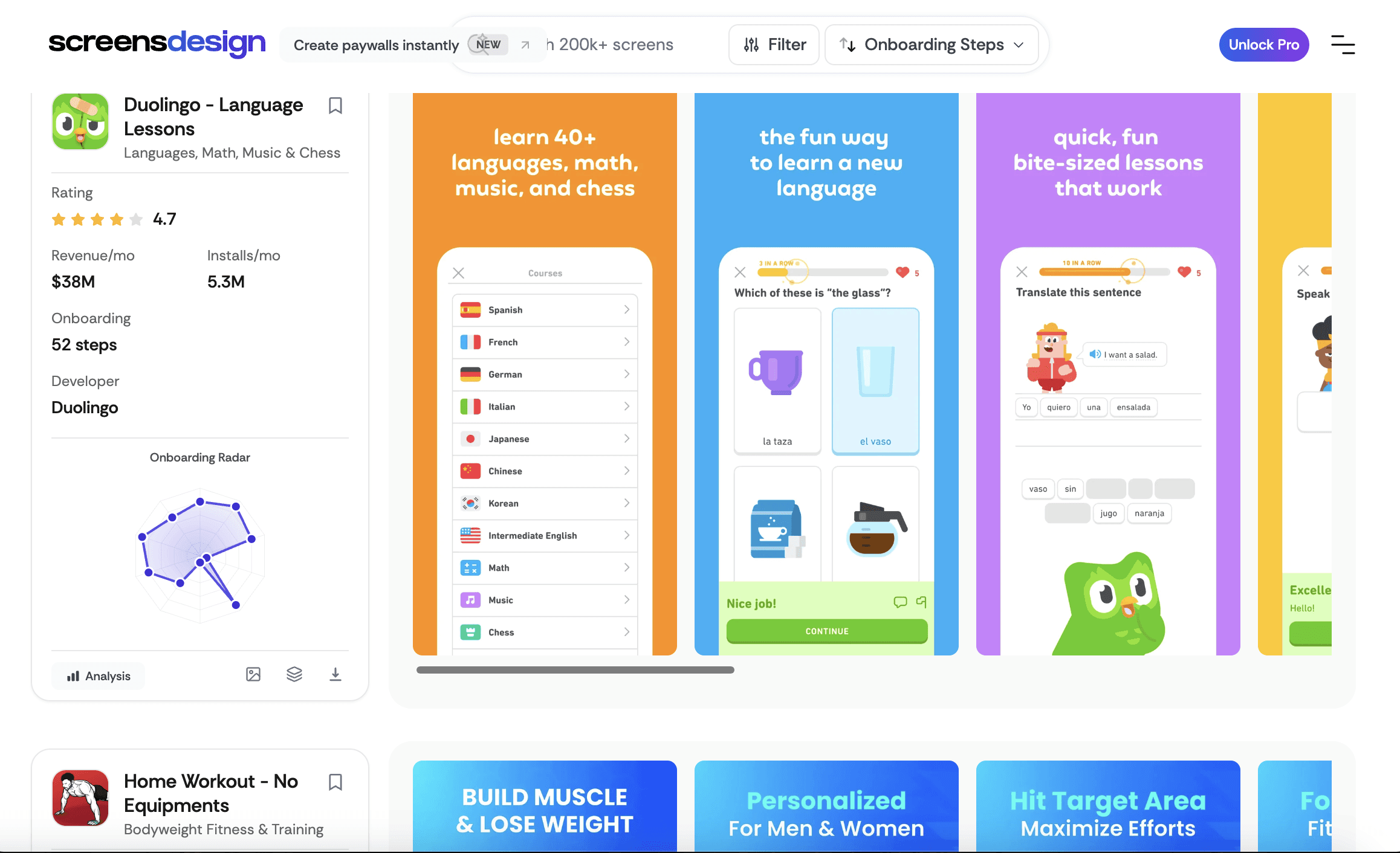 You can browse real app screens, but also see how they perform. Some listings include data like installs, revenue, ratings, and onboarding steps. This helps you understand not just how a screen looks, but why it works. You can break down flows like Duolingo and see patterns such as step-by-step onboarding, clear value messaging, and paywall timing.
