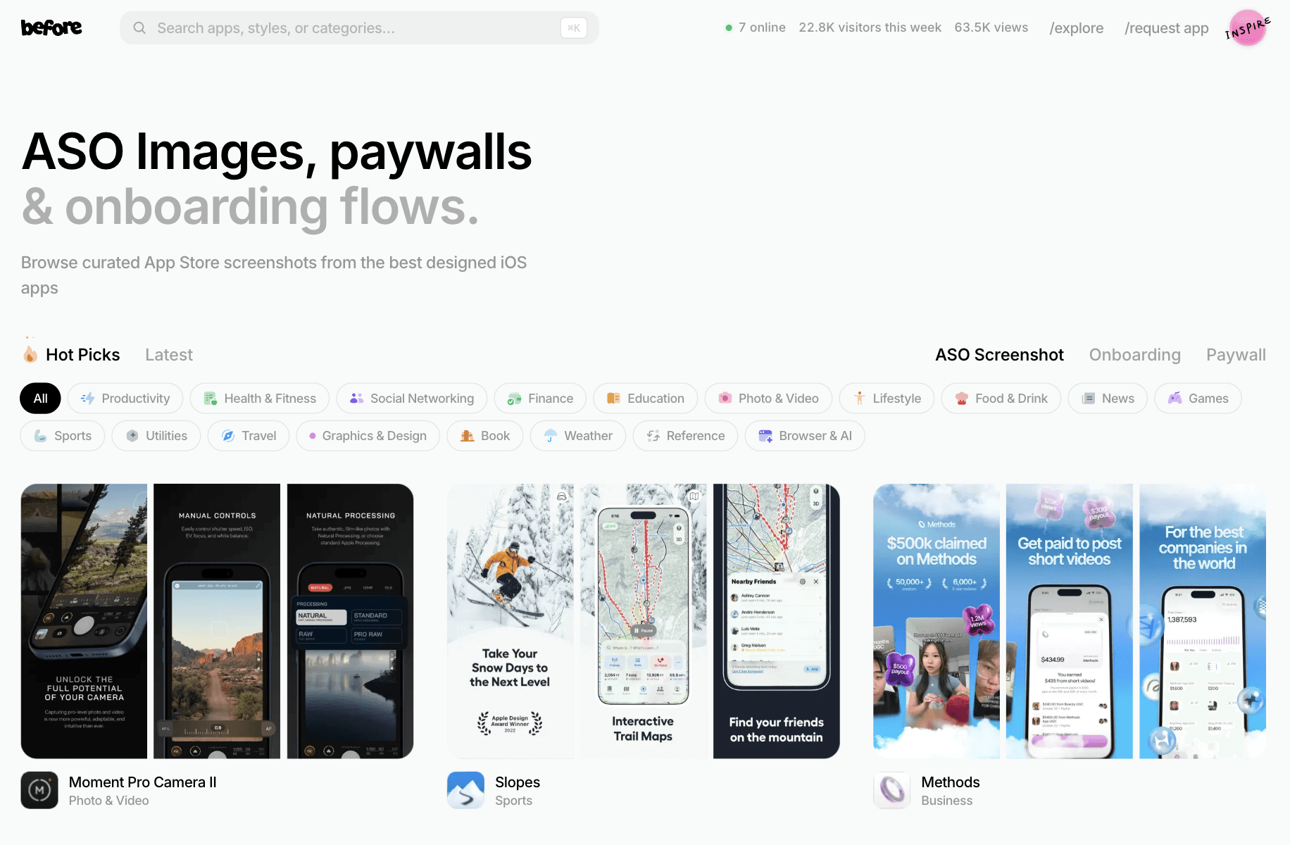 BeforeClick is a focused gallery for App Store screenshots built around one goal. Help you design visuals that drive installs. It highlights real examples from top iOS apps, with strong emphasis on ASO, paywalls, and onboarding screens that impact conversion.