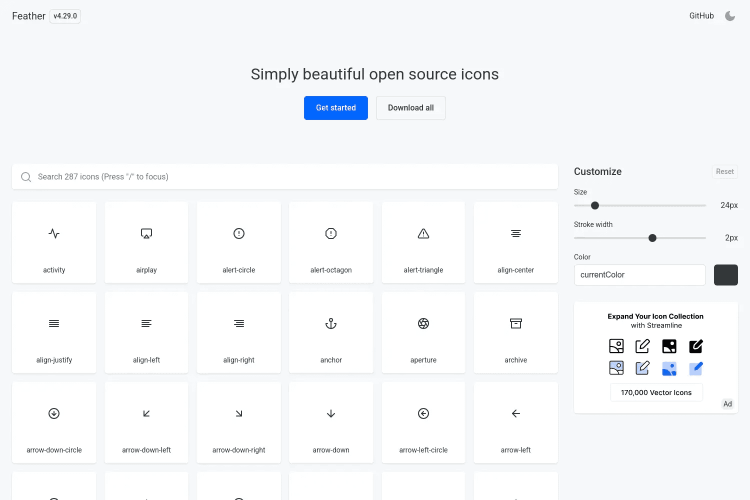 Feather Icons is a clean and minimal icon set built for modern interfaces. It offers around 280+ icons, all designed on a consistent 24x24 grid. Every icon follows the same simple style, which makes your UI look neat and balanced.
