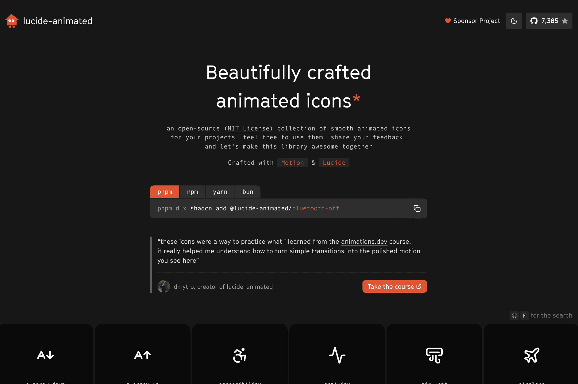 Lucide Animated is fully free under the MIT License. It is best suited for developers working in React who want lightweight animated icons without using Lottie files. There are also community ports for frameworks like Flutter and Svelte. There is no pricing. Everything is free and ready to use.