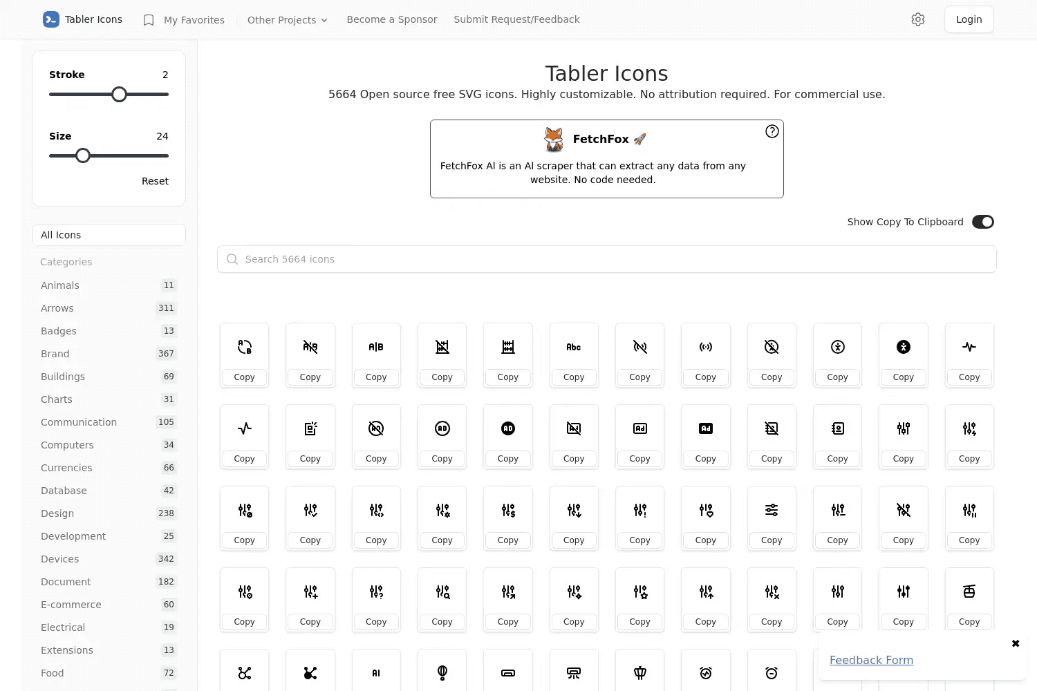 Tabler Icons is a large open-source icon set with over 6,000 SVG icons. All icons follow a consistent 24x24 grid with a 2px stroke, which keeps everything clean and aligned. This makes it a strong choice for dashboards, apps, and modern web interfaces.
