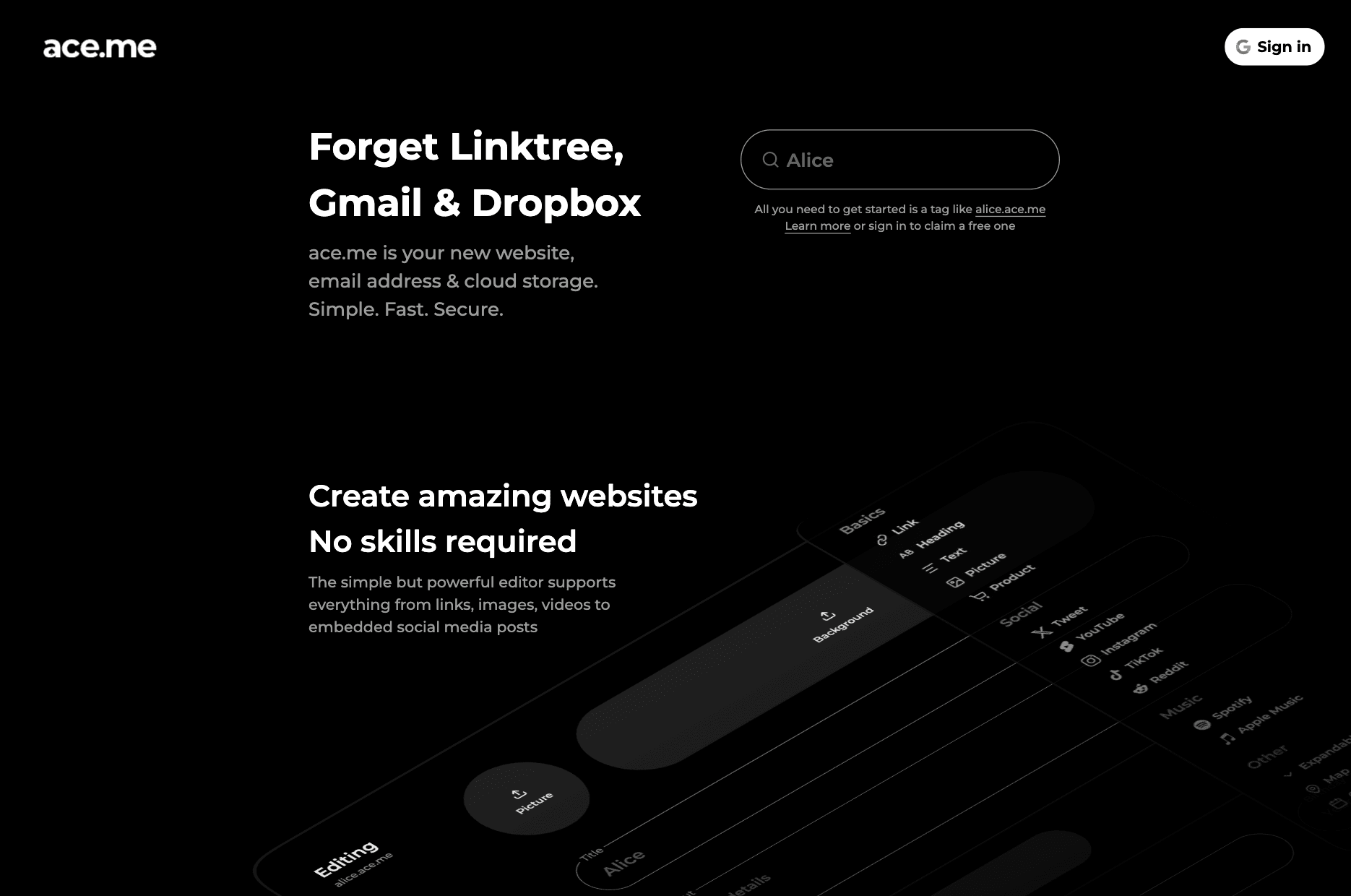 ace.me is more than a link in bio. It gives you a personal site, a custom email address, and cloud storage using one short tag. That tag becomes your username, your website, and your email. For example, one name works as both a link and an email address.