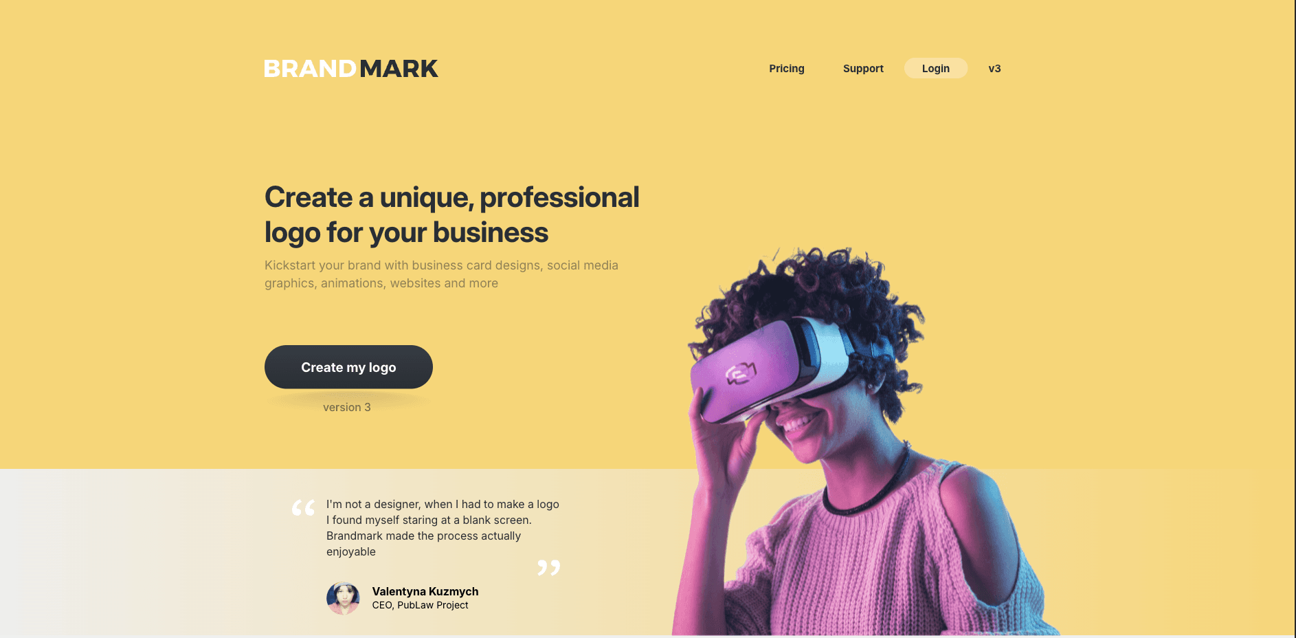 Brandmark is an AI logo generator that focuses on creating simple, professional logos along with ready-to-use brand assets. You start by entering your business name and keywords that describe your brand.