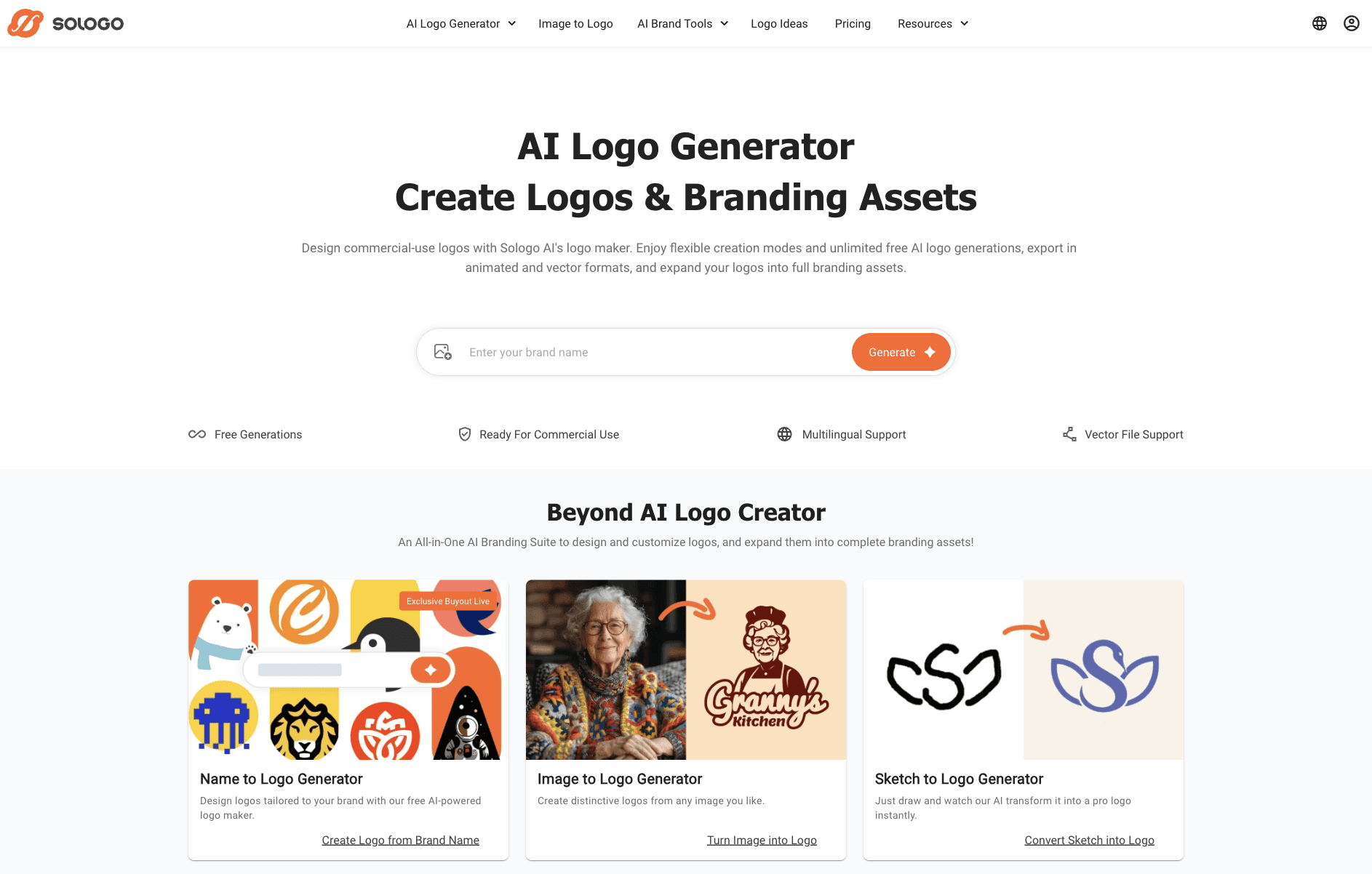 Sologo AI is a flexible logo generator designed to create logos from text, images, or sketches. You can start by entering a brand name, uploading an image, or drawing a rough idea.