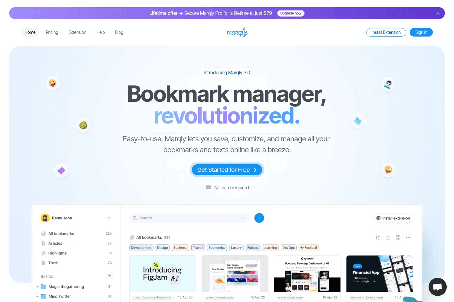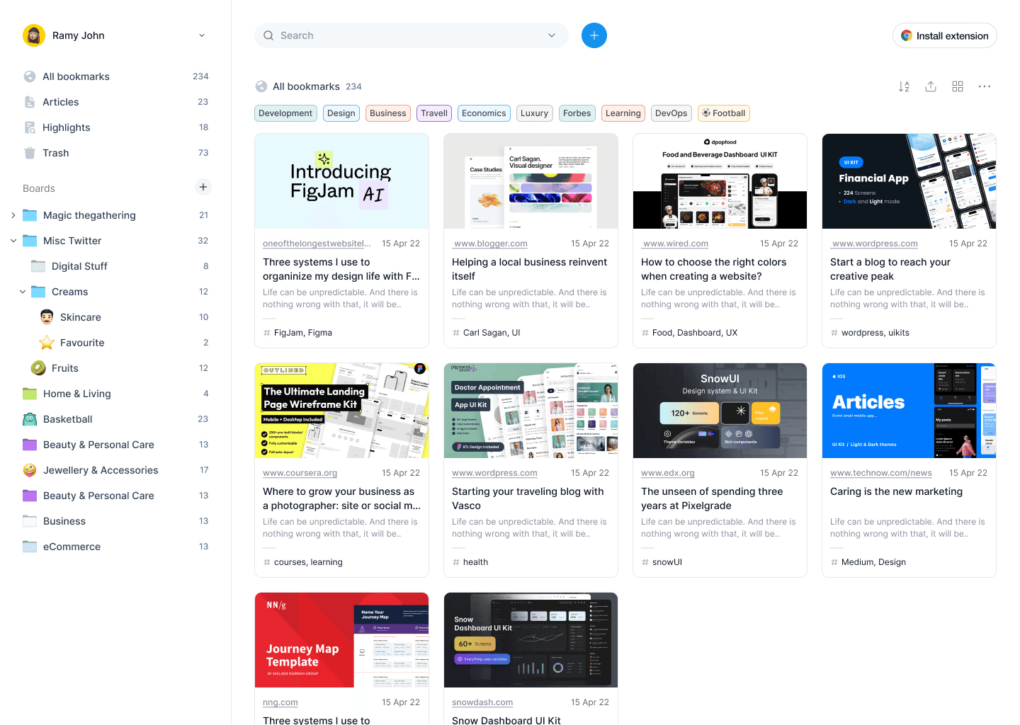 It lets you store links, highlight text, tag items, and sort everything into custom boards. The interface is straightforward, so you can manage bookmarks without clutter or confusion. You can view items in different layouts, customize icons, and arrange boards to match the way you work.