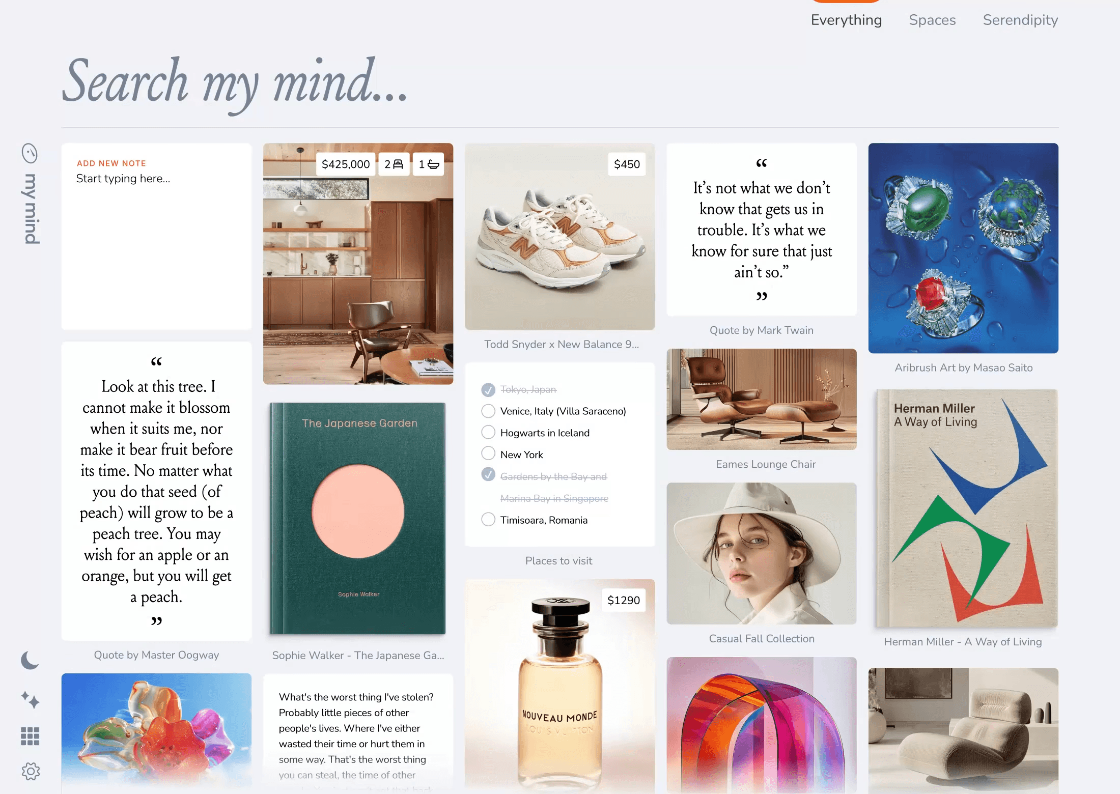 mymind is a private workspace where you can save anything you want to remember. It keeps your notes, bookmarks, images, articles, and ideas in one place. You do not need folders, labels, or tags.