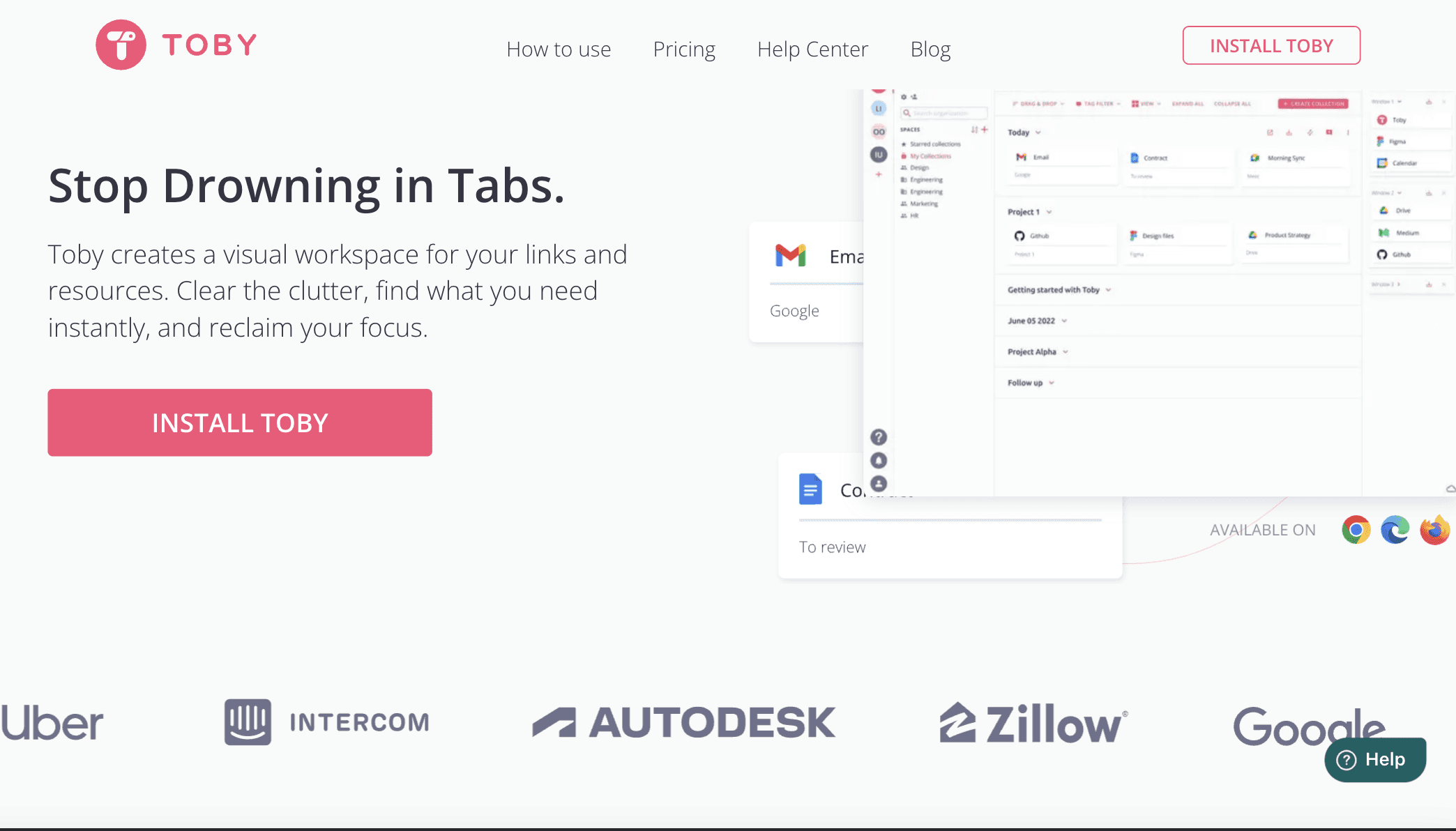 Toby runs on Chrome, Edge, and Firefox, with web and mobile apps for access outside the browser.