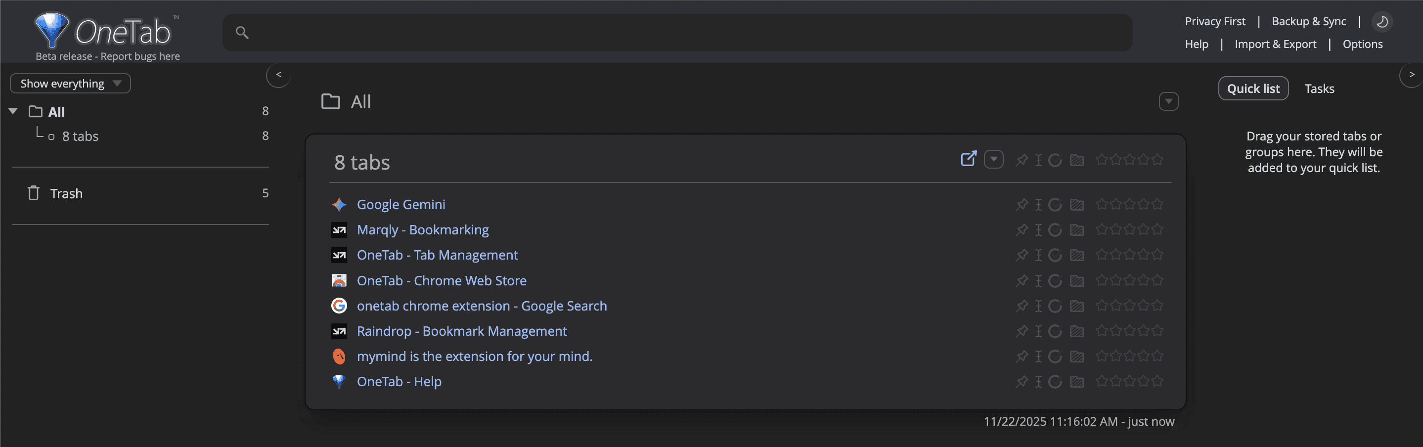The tool includes export and import options, so you can move your tab list between devices or keep a backup. Even if your browser crashes or restarts, your OneTab list stays safe.
