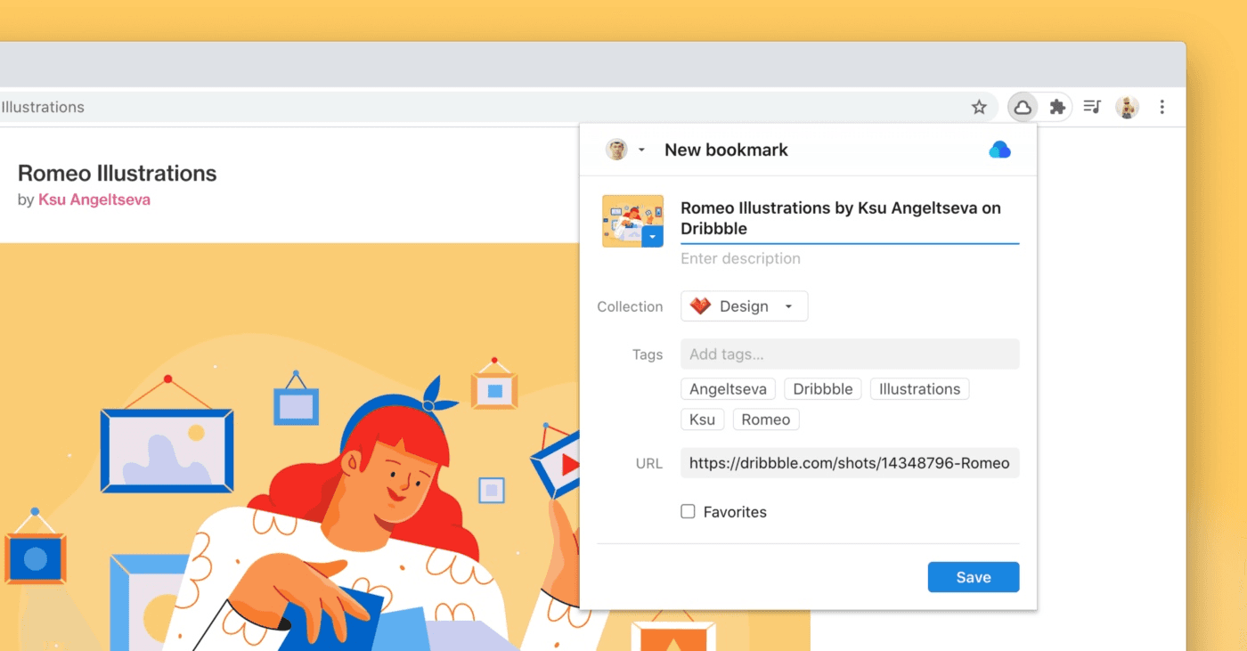 The extension helps you collect resources fast. You can save tabs, documents, designs, and project links in one click. Once saved, items live inside workspaces called Spaces.