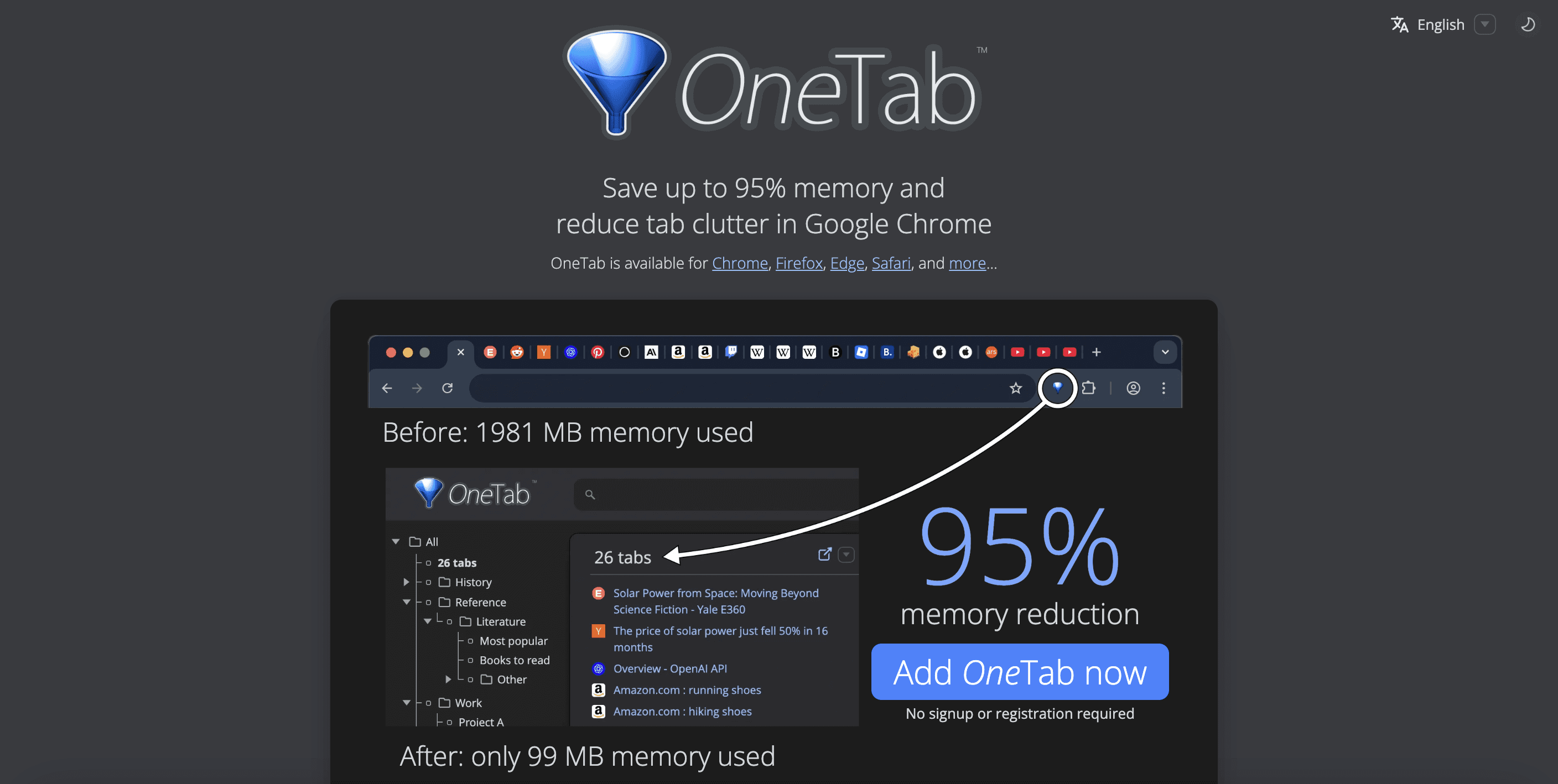 OneTab is a simple tool that clears tab clutter in one click. When your browser fills up with tabs, you can hit the OneTab icon and turn everything into a clean list.