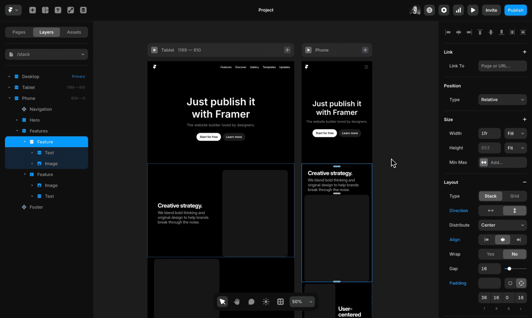 Framer also bridges the gap between UX design and production by letting teams publish live, responsive websites directly from the tool. The platform offers breakpoints, layout controls, and responsive components that adapt cleanly to different screen sizes.