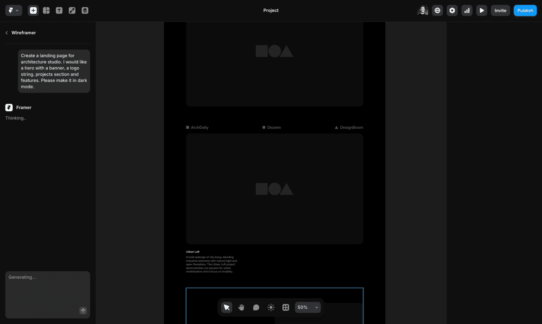 Real-time collaboration makes it easy to share prototypes, gather feedback, and refine designs together. Framer’s AI tools generate layout options and components, helping teams skip blank-page moments and explore multiple directions quickly.