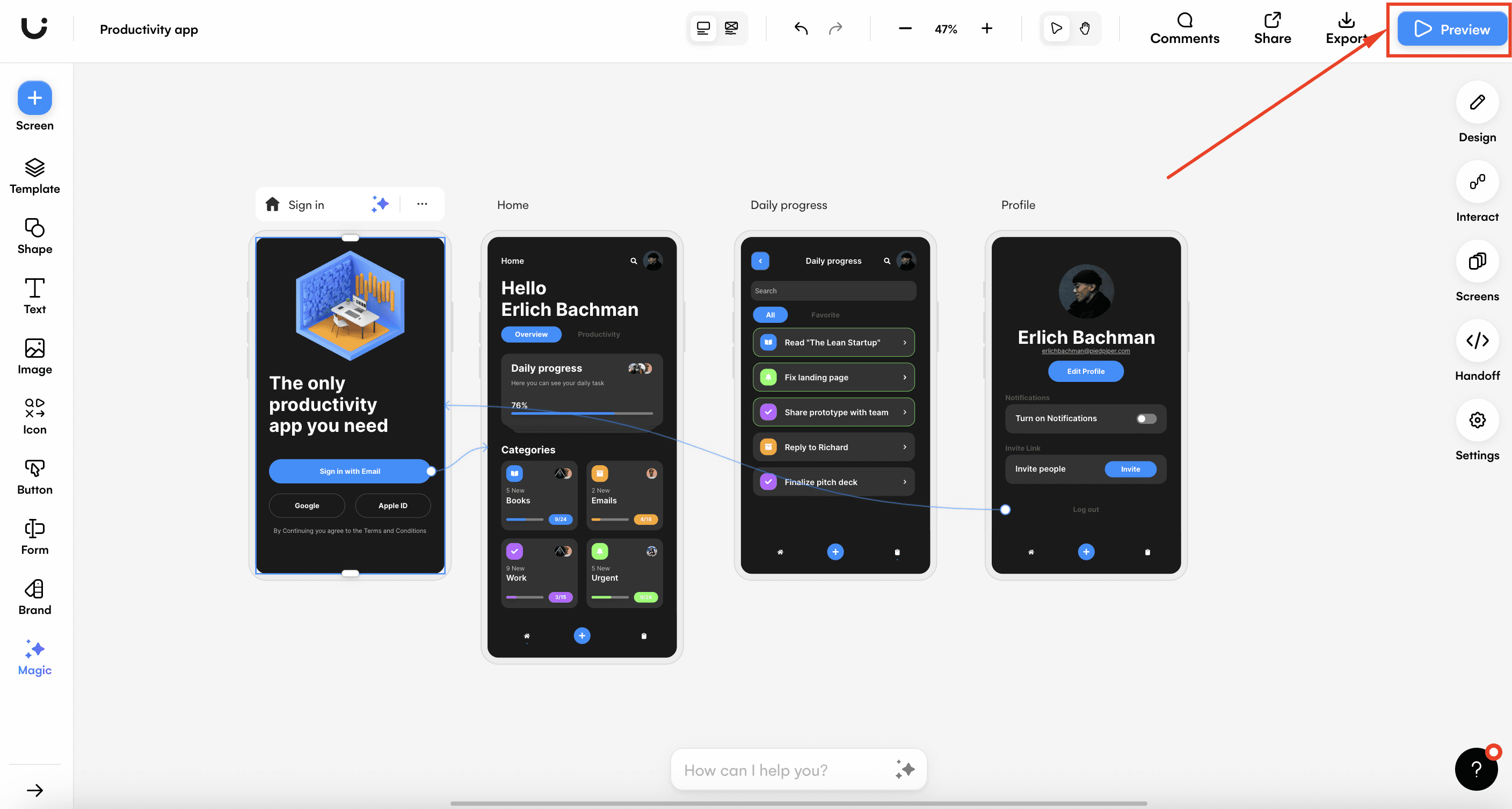 The interface feels familiar for teams used to Miro, so collaboration, comments, and real-time updates come naturally. Uizard’s strength is how quickly it assembles full user flows, giving you multiple connected screens rather than single isolated layouts.