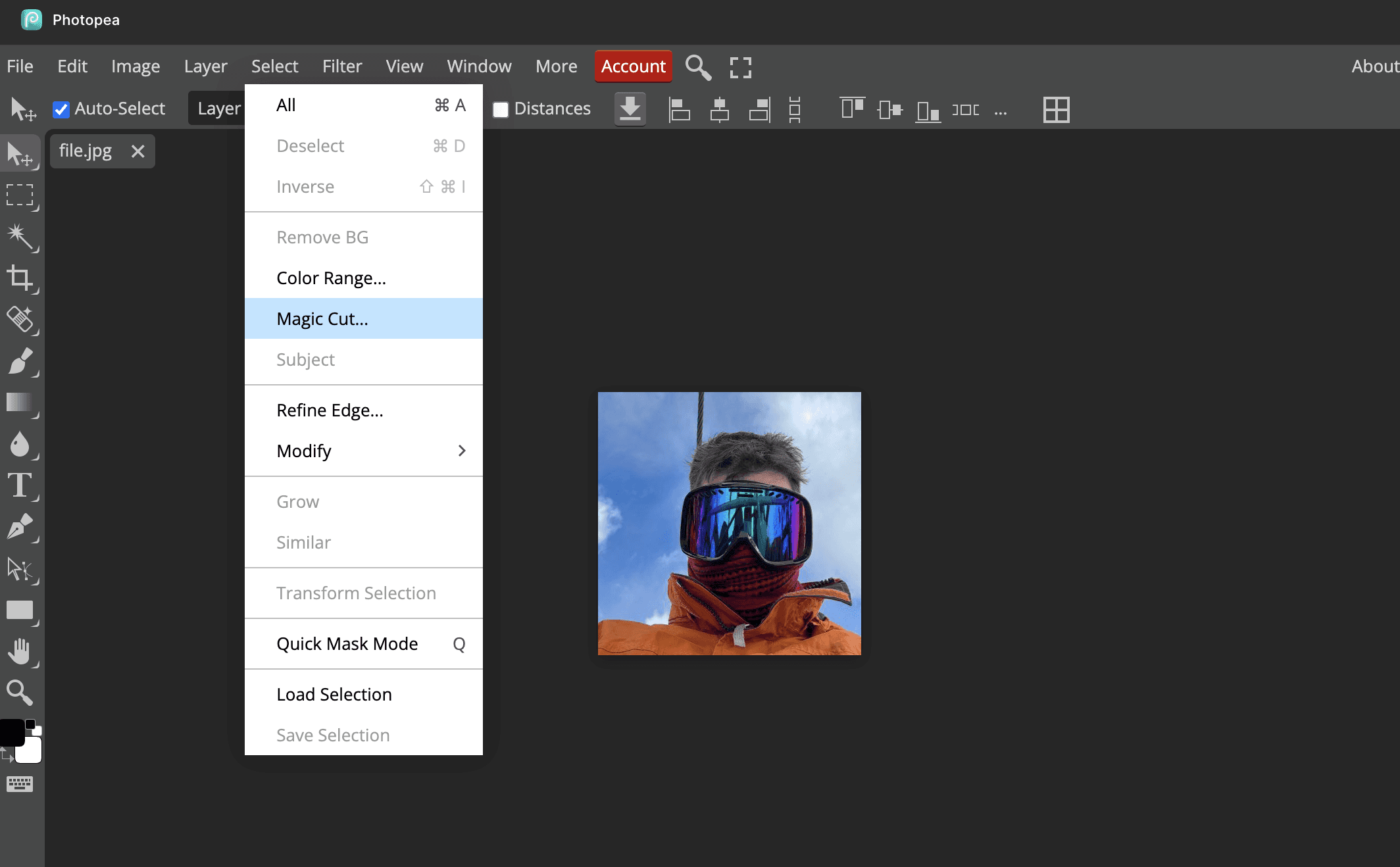 To remove the background quickly, use Select > Remove BG, which applies AI-powered background removal in one click.