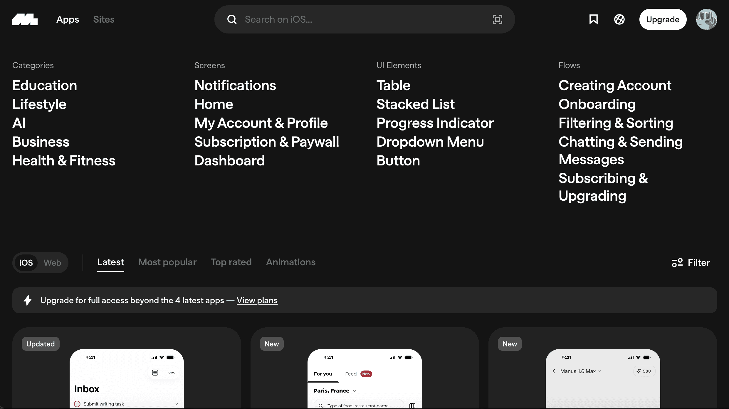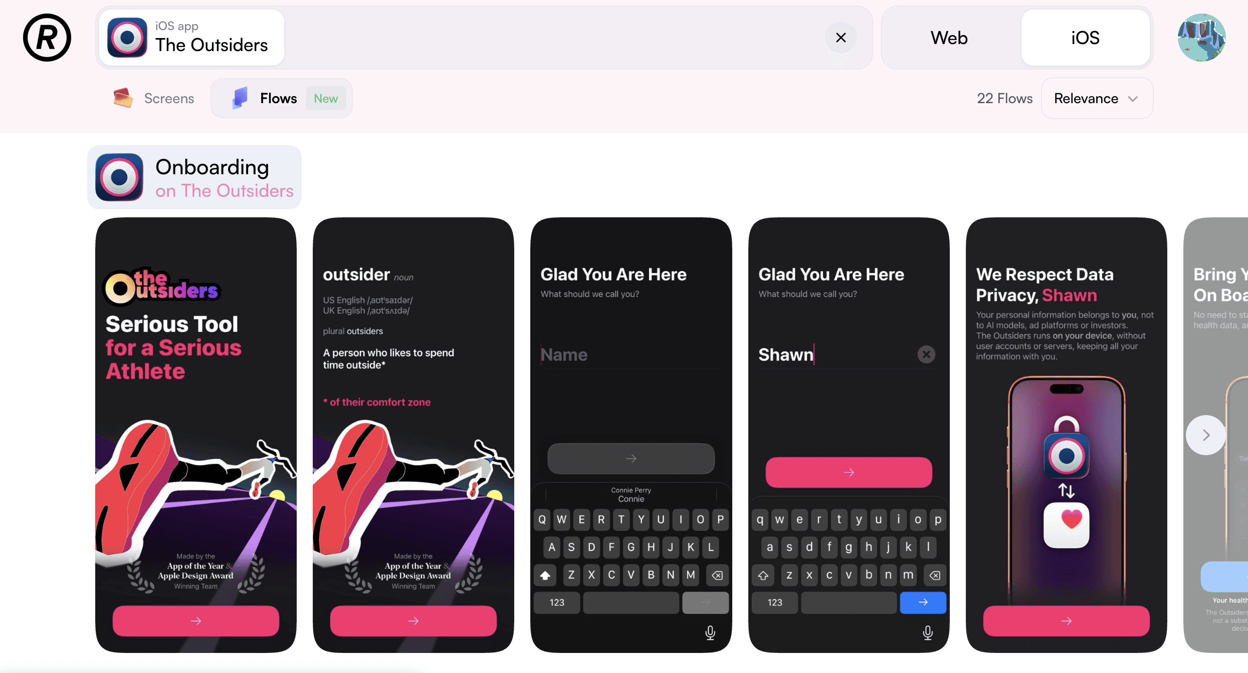 Mobbin has one of the largest libraries in this space. It includes over a thousand iOS and web apps, hundreds of thousands of screens, and tens of thousands of full user flows.