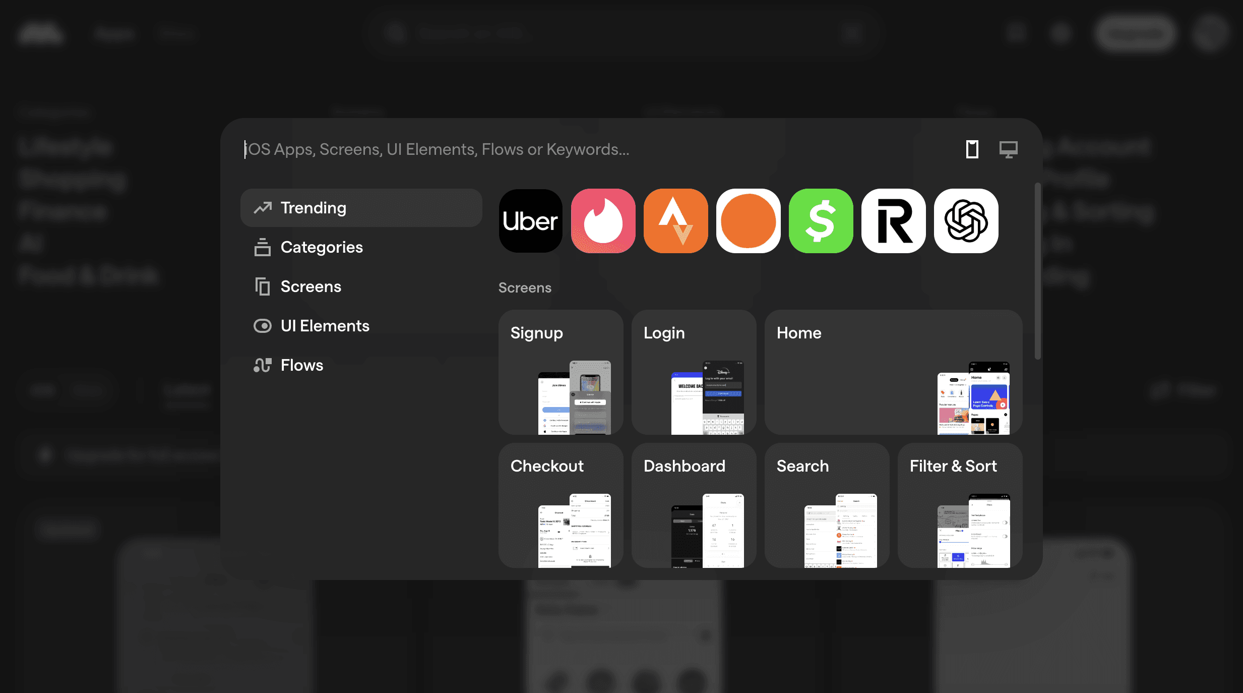 Mobbin focuses on pattern-based discovery. You search by UI elements, screens, or flows like login, checkout, or onboarding.