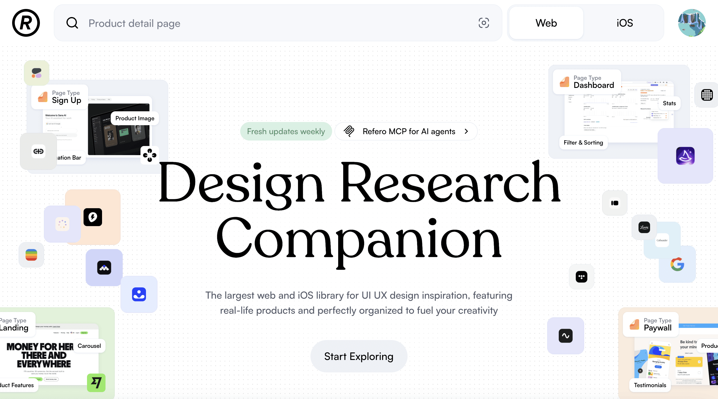 Refero is a design inspiration library built for quick and focused research. It mainly targets web and iOS interfaces and keeps everything clean, curated, and easy to explore.