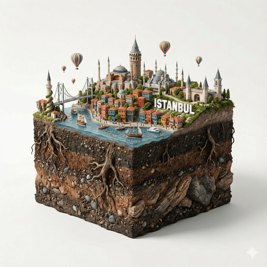 "Create a hyper-realistic 3D square diorama of Istanbul. The city appears carved out as a solid block with a visible underground cross-section showing soil, rocks, roots, and earth layers. Above the ground, display a whimsical fairytale-style cityscape featuring iconic landmarks, architecture, and cultural elements of Istanbul. Integrate a modern white “Istanbul” label naturally into the scene. Use a pure white studio background with soft natural lighting. DSLR photo quality, crisp details, vibrant colors, magical realism style. 1080x1080 resolution."