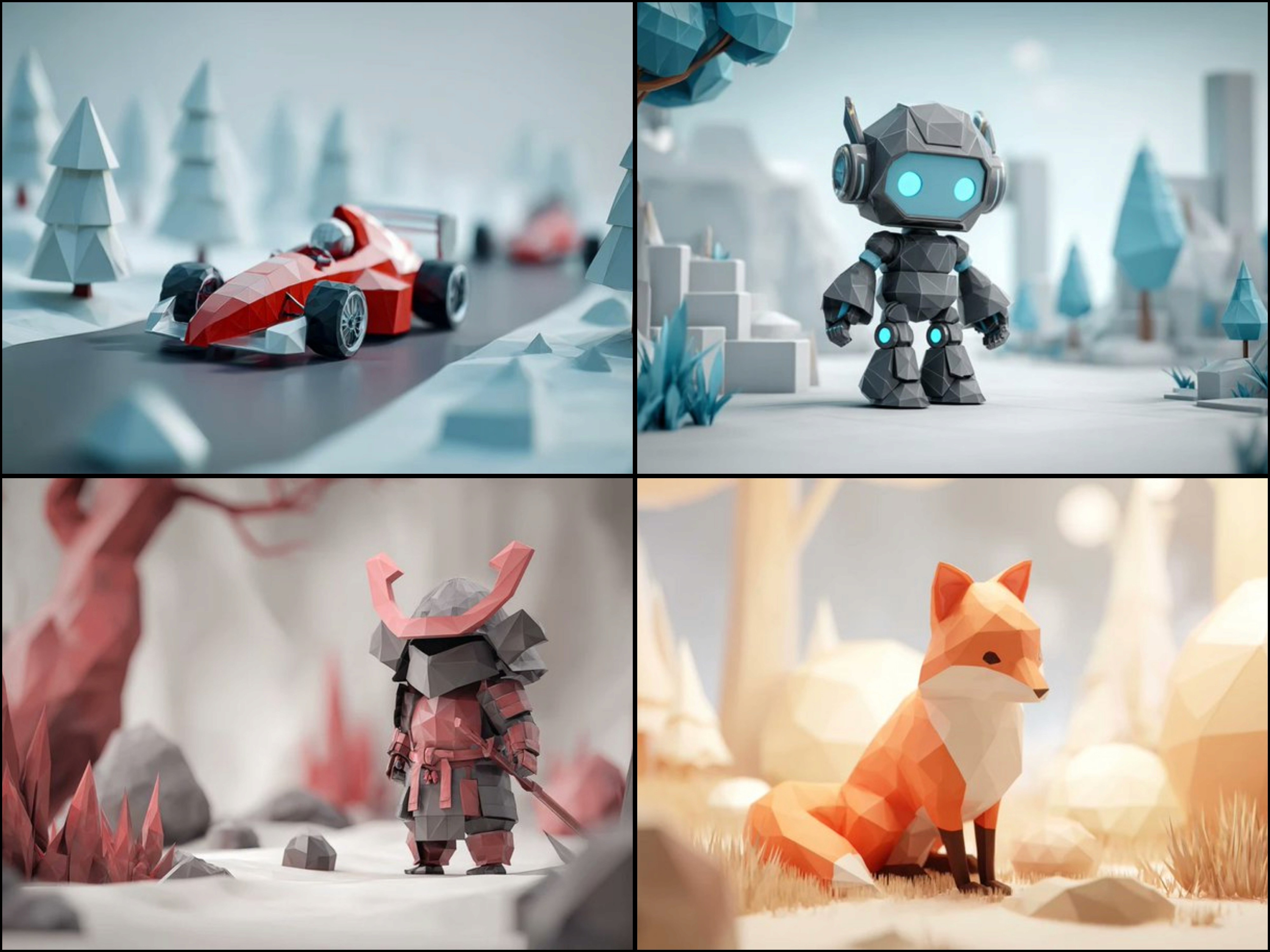 "A low-poly 3D render of a [subject], constructed from clean triangular facets and shaded in flat [color1] and [color2] tones. Set in a stylized minimalist environment with crisp geometry and soft ambient occlusion, the scene evokes a playful, digital diorama with sharp edges and visual simplicity."