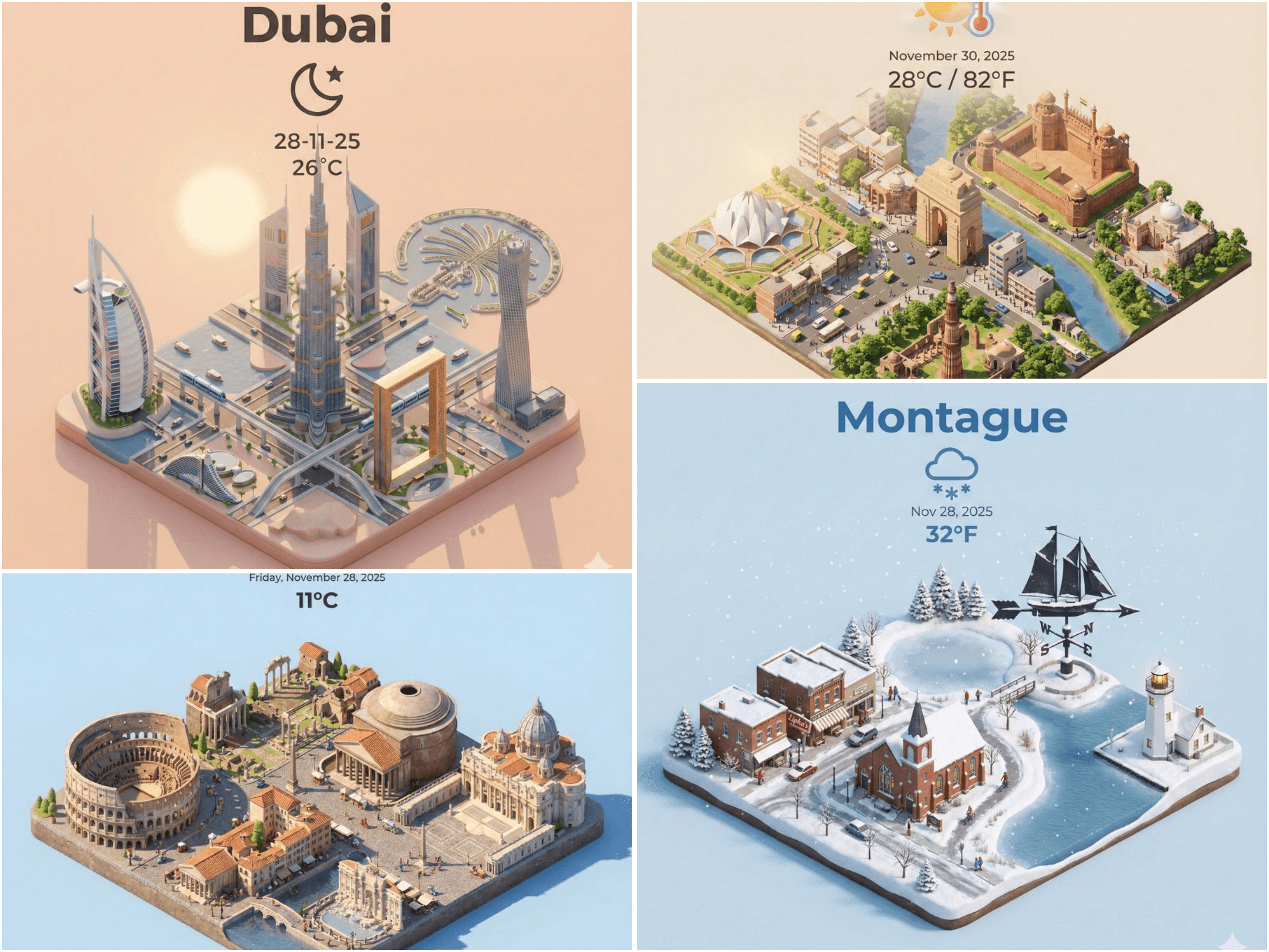 This prompt combines city miniatures with live weather-style graphics in a clean, modern layout.
