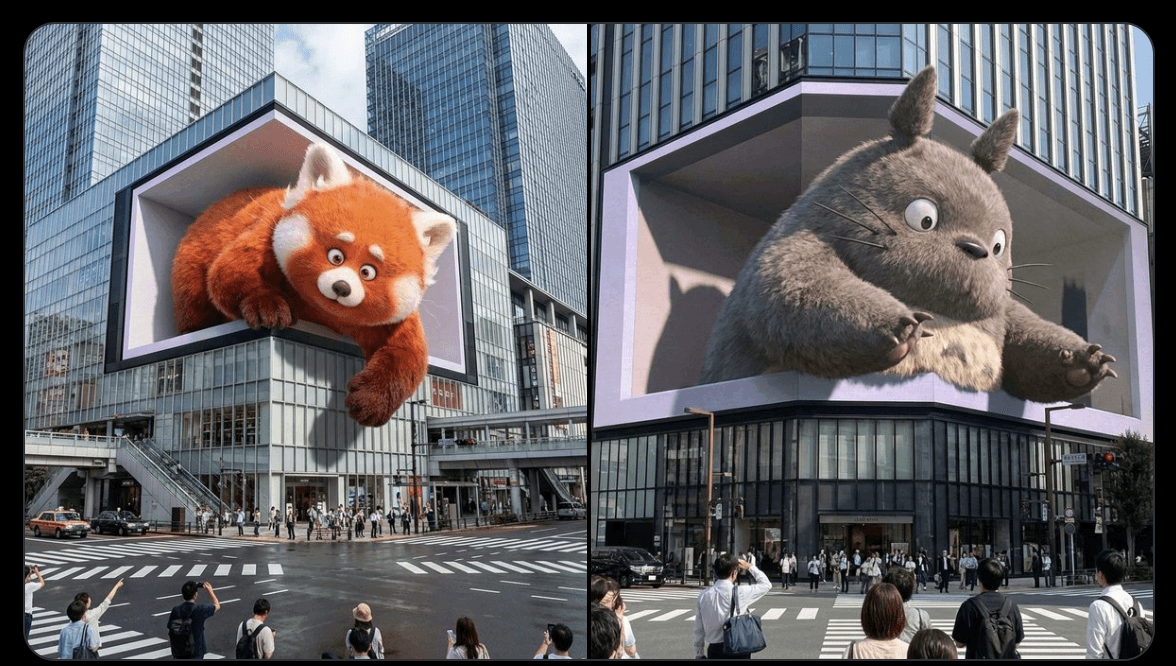 "An enormous L-shaped glasses-free 3D LED screen situated prominently at a bustling urban intersection, designed in an iconic architectural style reminiscent of Shinjuku in Tokyo or Taikoo Li in Chengdu. The screen displays a captivating glasses-free 3D animation featuring [scene description]. The characters and objects possess striking depth and appear to break through the screen’s boundaries, extending outward or floating vividly in mid-air. Under realistic daylight conditions, these elements cast lifelike shadows onto the screen’s surface and surrounding buildings. Rich in intricate detail and vibrant colors, the animation seamlessly integrates with the urban setting and the bright sky overhead.