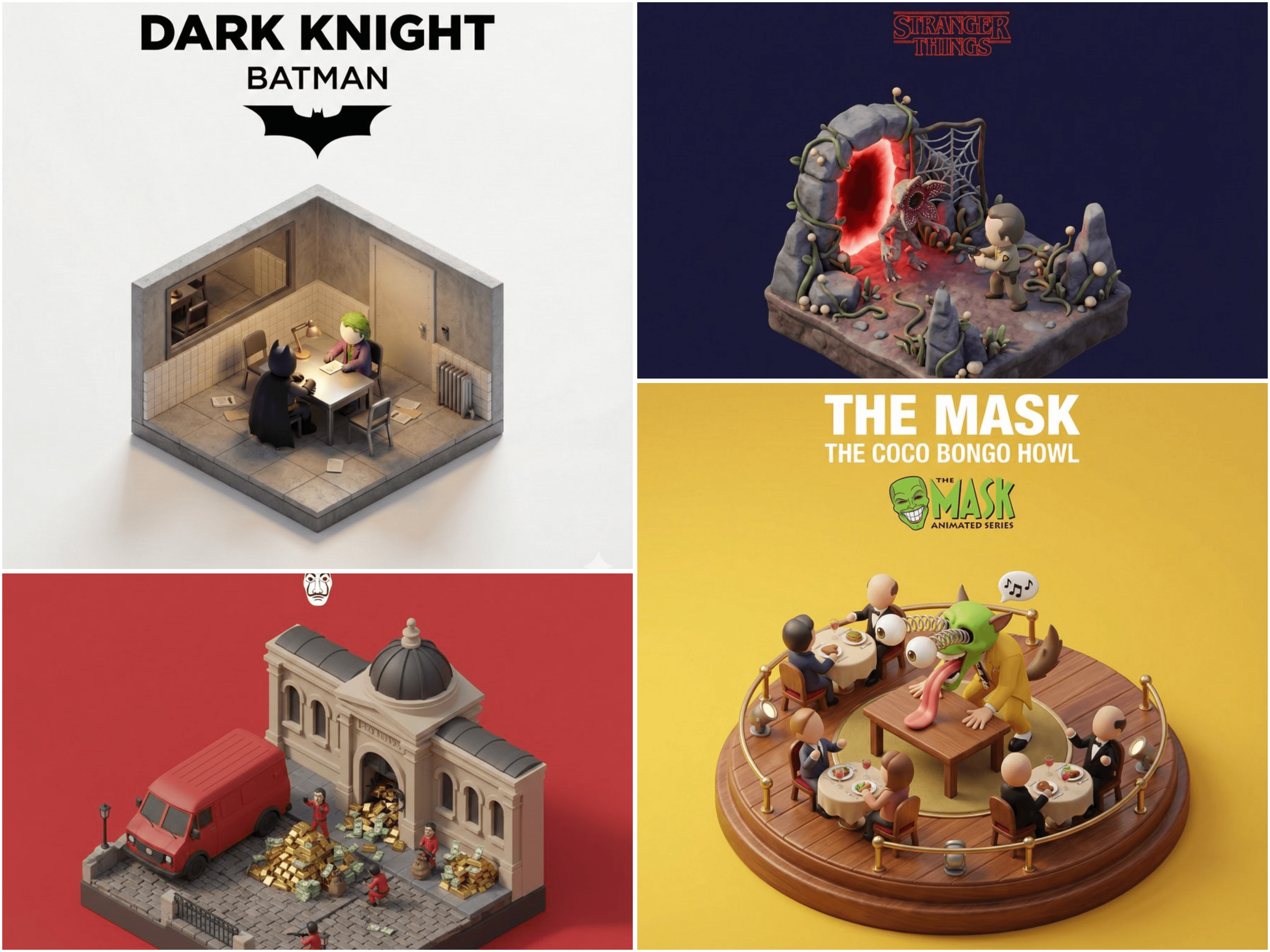 This format recreates iconic movie scenes or locations as collectible isometric dioramas.