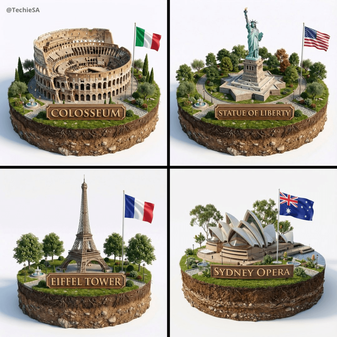 "Create a hyper-realistic 3D diorama-style miniature of [LANDMARK NAME]. The model sits on a raised earth cross-section showing detailed soil and rock layers beneath a lush grassy surface. The landmark must be proportionally accurate and highly detailed. Surround it with region-appropriate elements such as street lamps, native trees, shrubs, pathways, and small water features. Place a large, elegant sign at the front displaying “[LANDMARK NAME]” in bold lettering. Add a tall flagpole beside the landmark with a clearly visible national flag waving. Use a soft white background to keep full focus on the model. 1080x1080 resolution."