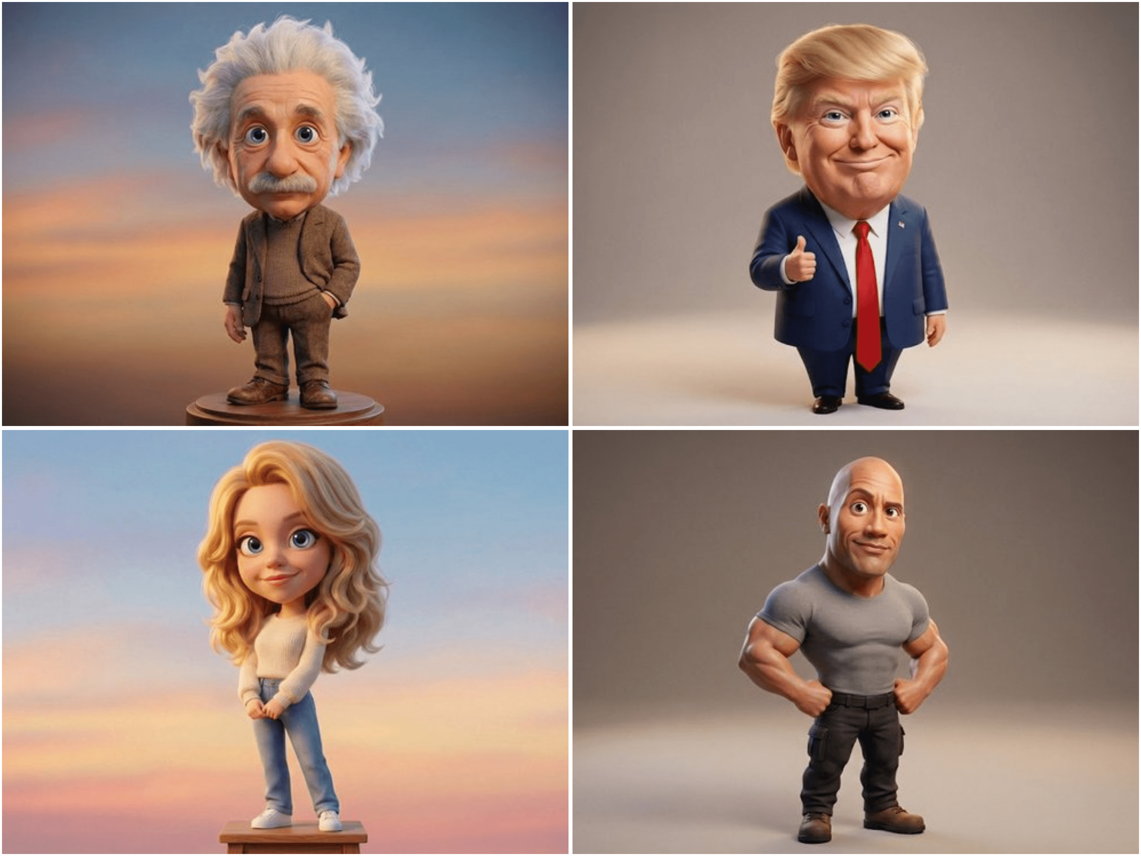 "Create a playful 3D caricature portrait of [CELEBRITY]. Blend cartoon-style exaggeration with realistic skin shading. Use an oversized head, stylized hair, and large expressive eyes. Apply soft cinematic lighting with clean, simplified materials. Keep the background minimal with a gentle blur to fully focus attention on the character."