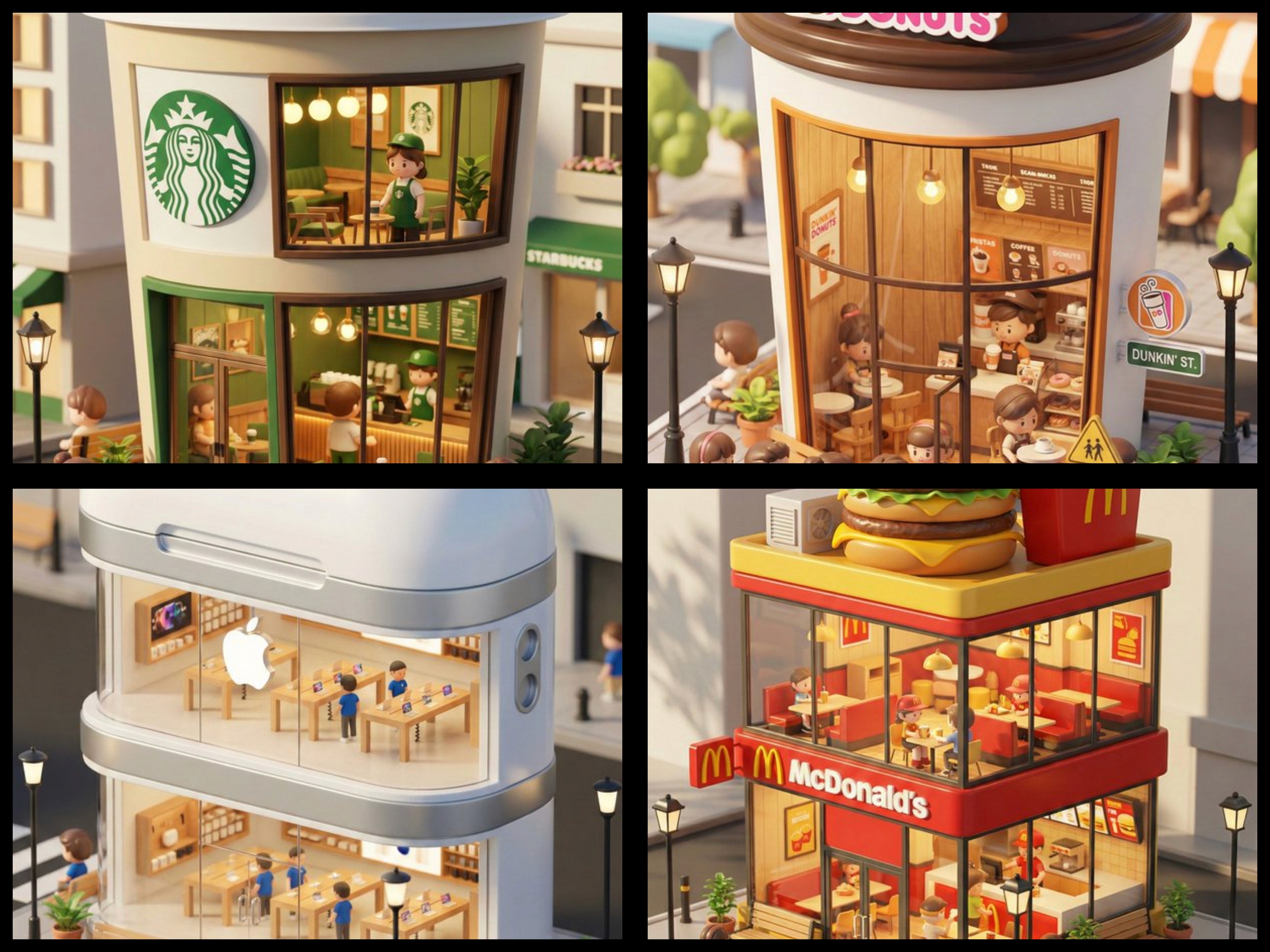 This prompt creates cute, collectible-style brand storefronts inspired by blind-box toys and miniature city scenes.