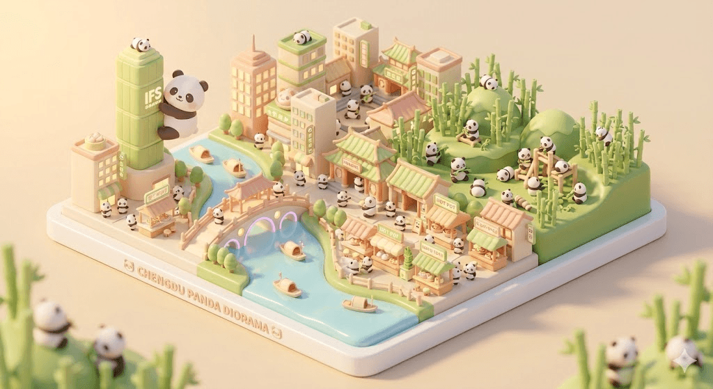 "Create an ultra-cute isometric 3D miniature city diorama of Chengdu with a panda theme. Use a soft pastel color palette with bamboo green, peach pink, and cream beige. Toy-like aesthetic with perfectly rounded edges and gentle saturation. No weather icons or floating text. Scene includes Chengdu downtown blended with Panda Base elements at 1:800 scale on a white platform. Include all major landmarks in cute proportions, chibi pandas, food stalls, boats, bamboo forests, and pastel signage. Camera: perfect 45-degree isometric view with shallow depth of field. Lighting: warm golden-hour sunlight with soft pastel rim light. Materials: glossy plastic mixed with matte pastel resin. 8K resolution, ultra-clean composition, base engraving only."