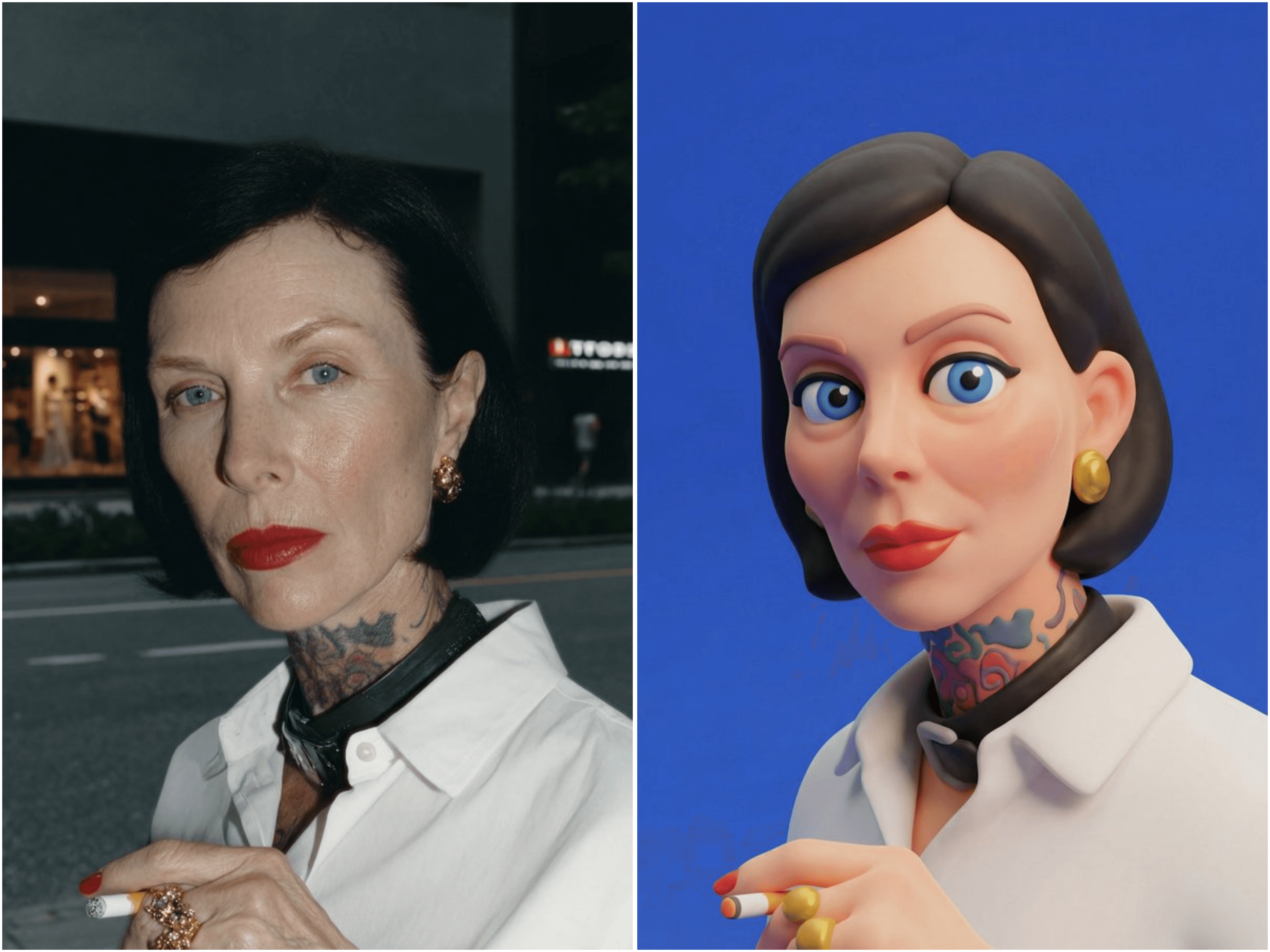 "Transform the subject into a stylized 3D character with soft clay-like materials. Use rounded sculptural forms, exaggerated facial features, and a pastel plus vibrant color palette. Apply smooth subsurface scattering skin, large cartoon eyes, and simplified anatomy. Render on a bold blue studio background with soft frontal lighting and subtle shadows. Keep the original photo’s composition and framing."