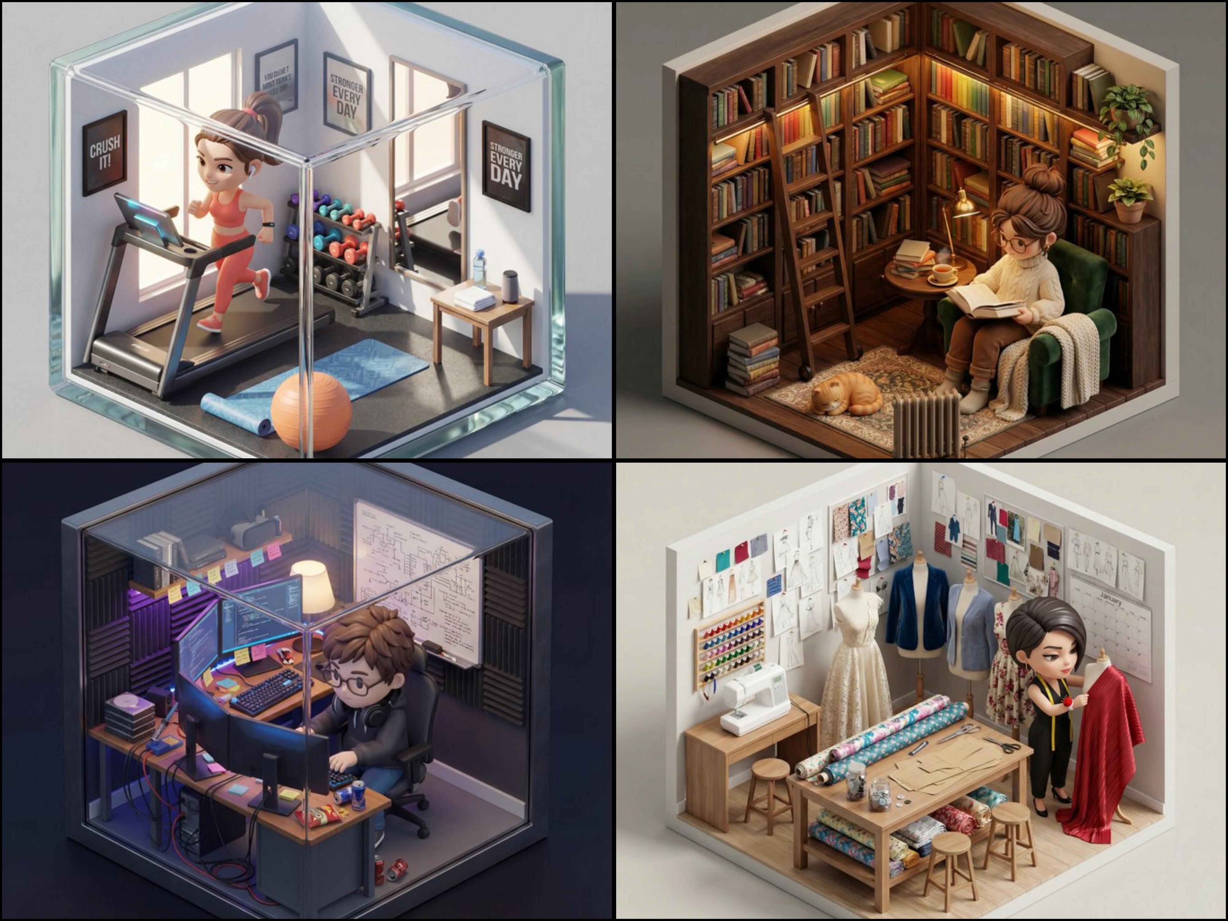 This prompt creates personalized cube rooms that look like collectible figures or desk toys.