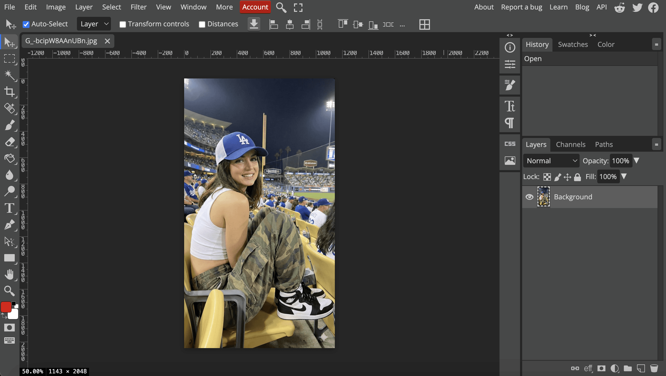 Go to photopea.com. Photopea runs fully in your browser, so no download or signup is needed.