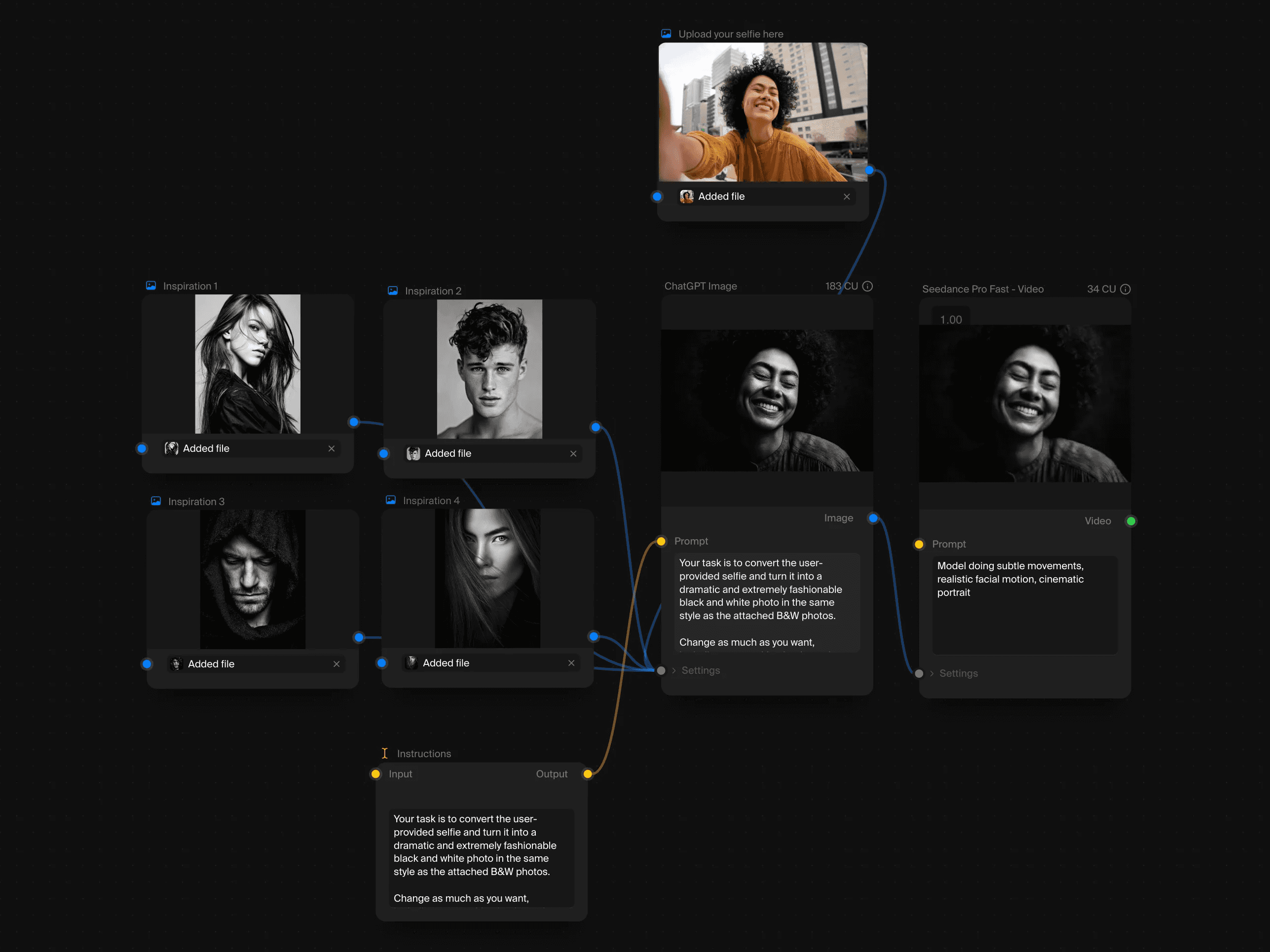 Nodes let you chain all of that together. The output of one step automatically feeds into the next. No exporting, re-uploading, or managing files across apps. It's one continuous pipeline.